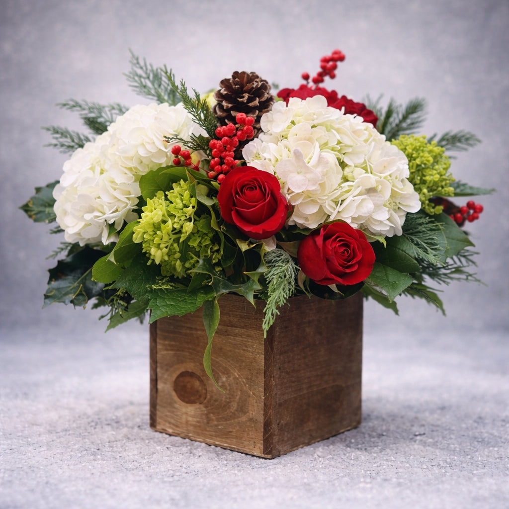 Un encantador arreglo floral con flores vibrantes, vegetación fresca y detalles decorativos festivos. Diseñado para capturar el espíritu navideño con elegancia, perfecto para decorar su hogar o regalar un detalle memorable.