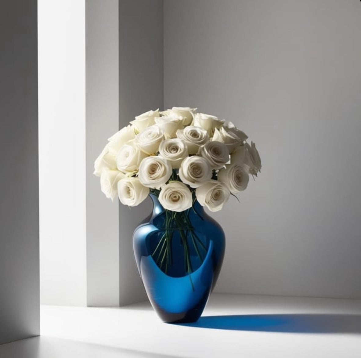 This arrangement brings together the calming shades of blue and 48 white roses, creating a harmonious display that captivates with is serene beauty.