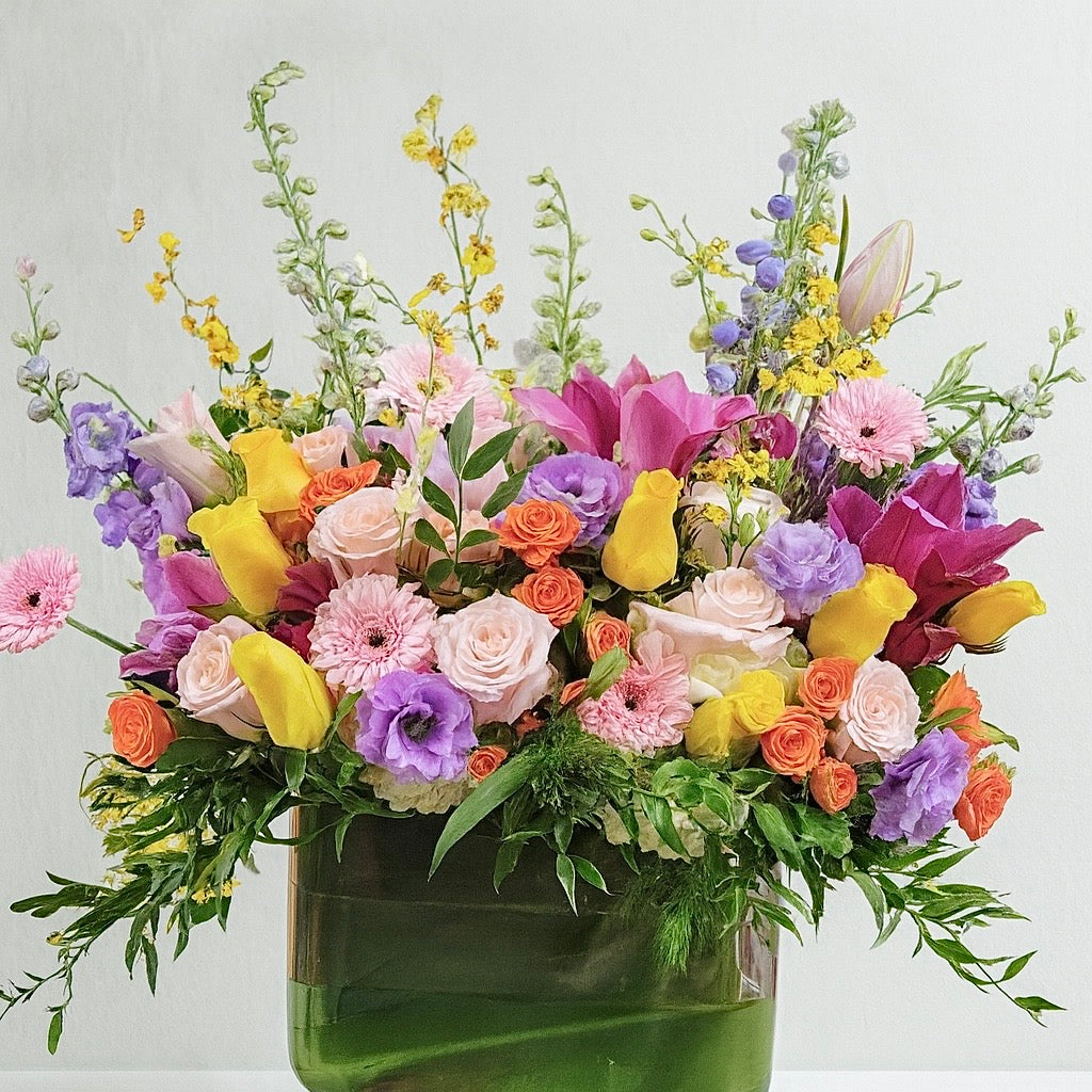This stunning dome-shaped floral arrangement features premium quality roses, carefully arranged to create a symmetrical and dazzling design. Presented in a clear glass vase that enhances the elegance of the bouquet, this arrangement is perfect for those looking to make a grand statement of graceful, joyful and admiration with a luxurious touch. Ideal for anniversaries, birthdays, grand events, or as a centerpiece for special occasions.