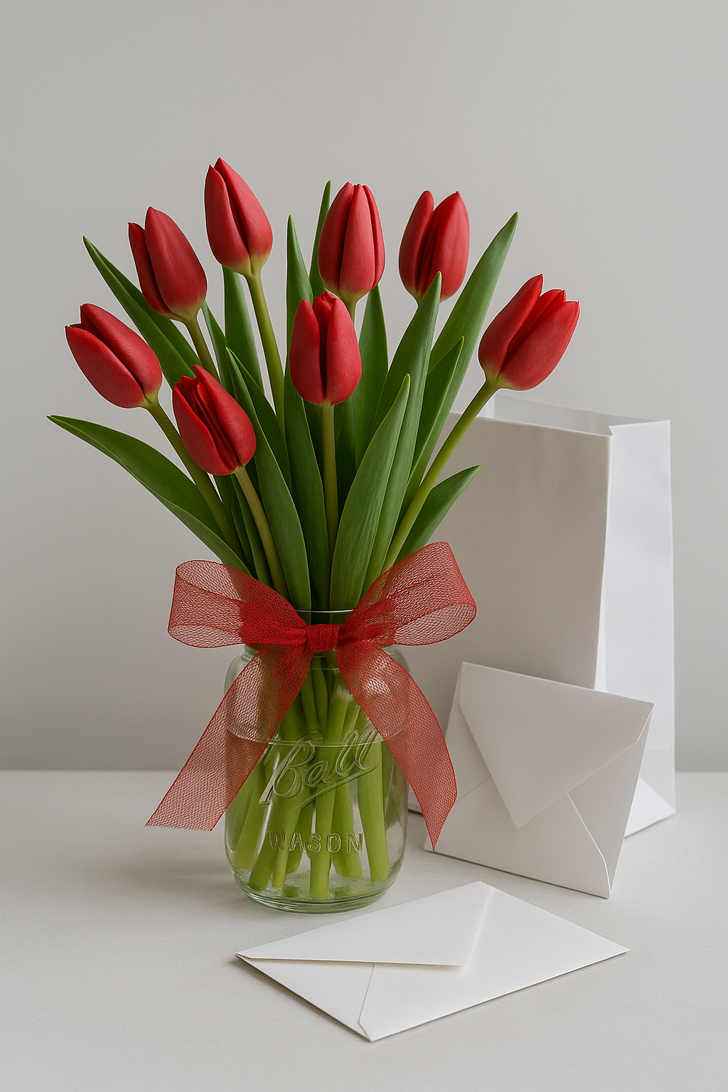 Red tulips in a Mason Jar. Ideal for any occasion gift. Special for lovers.