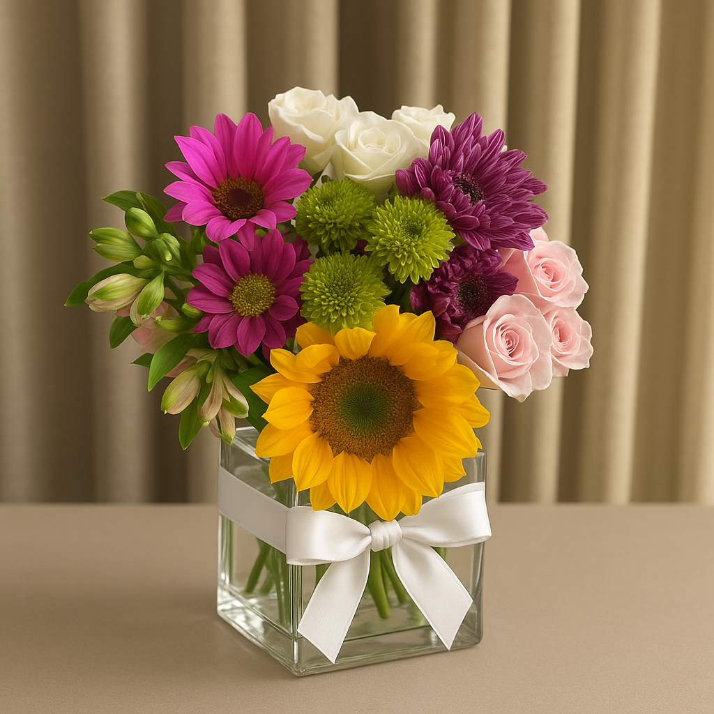 Fresh selection of blooms with bright colors in a square vase. Ideal for just because and friendship moments. Blooms may vary depending season.